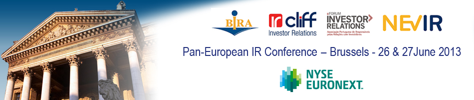 In succession of last year's inaugural IR event, the Investor Relations Associations of Belgium (BIRA), France (CLIFF), the Netherlands (NEVIR) and Portugal (FIR) has successfully organised the second Pan-European IR Conference organised in Brussels on June 26 & 27, 2013.